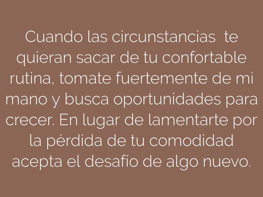 Cuando las circunstancias te quieran sacar de tu confortable rutina, tomate fuertemente de mi mano y busca oportunidades para crecer. En lugar de lamentarte por la pérdida de tu comodidad acepta el desafío de algo nuevo.