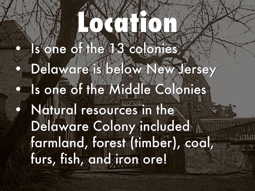 • Natural resources in the Delaware Colony included farmland, forest (timber), coal, furs, fish, and iron ore!