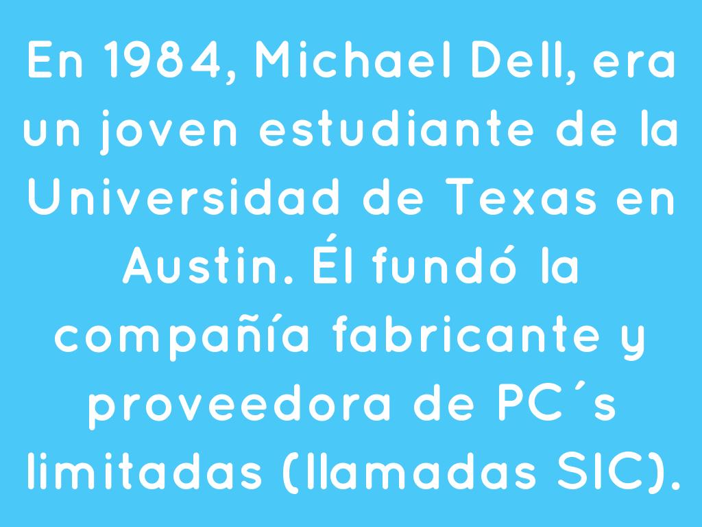 En 1984, Michael Dell, era un joven estudiante de la Universidad de Texas en Austin. Él fundó la compañía fabricante y proveedora de PC´s limitadas (llamadas SIC).