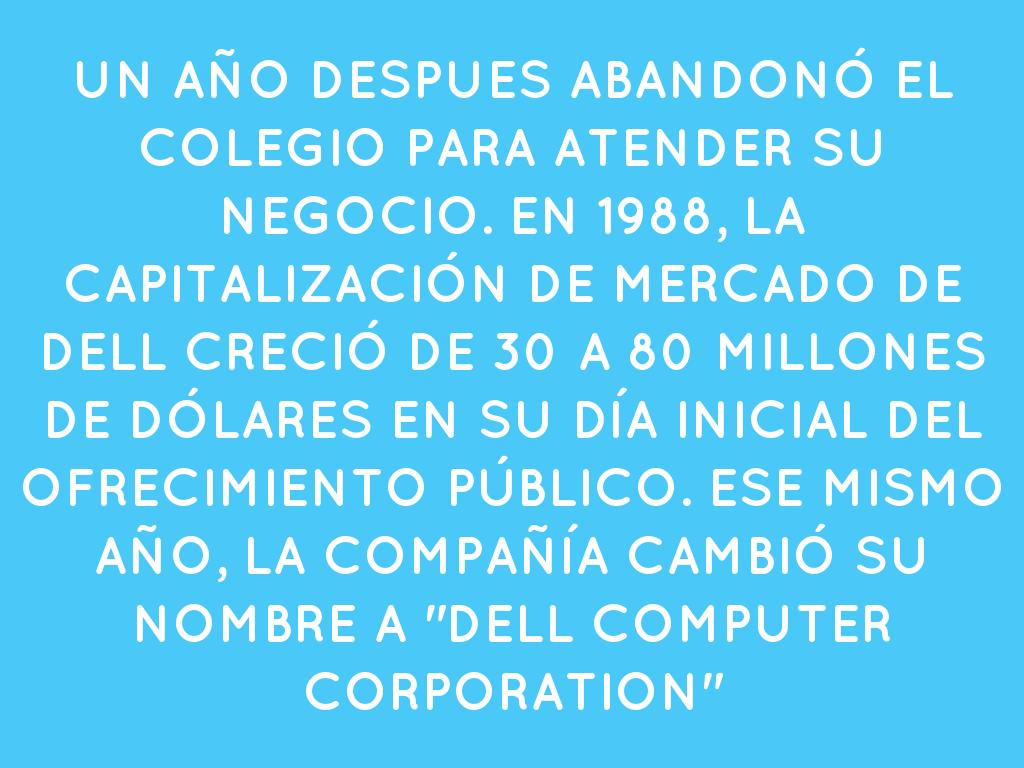 UN AÑO DESPUES ABANDONÓ EL COLEGIO PARA ATENDER SU NEGOCIO. EN 1988, LA CAPITALIZACIÓN DE MERCADO DE DELL CRECIÓ DE 30 A 80 MILLONES DE DÓLARES EN SU DÍA INICIAL DEL OFRECIMIENTO PÚBLICO. ESE MISMO AÑO, LA COMPAÑÍA CAMBIÓ SU NOMBRE A "DELL COMPUTER CORPORATION"