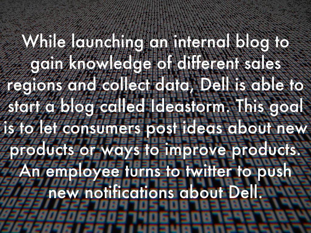 While launching an internal blog to gain knowledge of different sales regions and collect data, Dell is able to start a blog called Ideastorm. This goal is to let consumers post ideas about new products or ways to improve products. An employee turns to twitter to push new notifications about Dell.