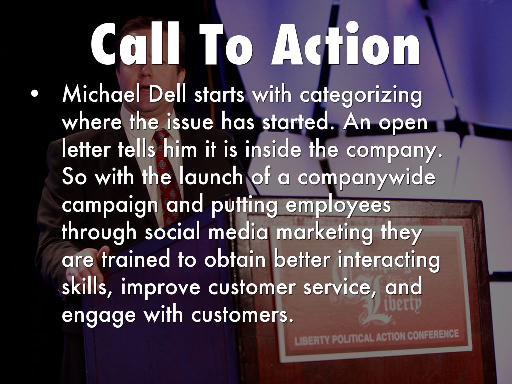 Michael Dell starts with categorizing where the issue has started. An open letter tells him it is inside the company. So with the launch of a companywide campaign and putting employees through social media marketing they are trained to obtain better interacting skills, improve customer service, and engage with customers.