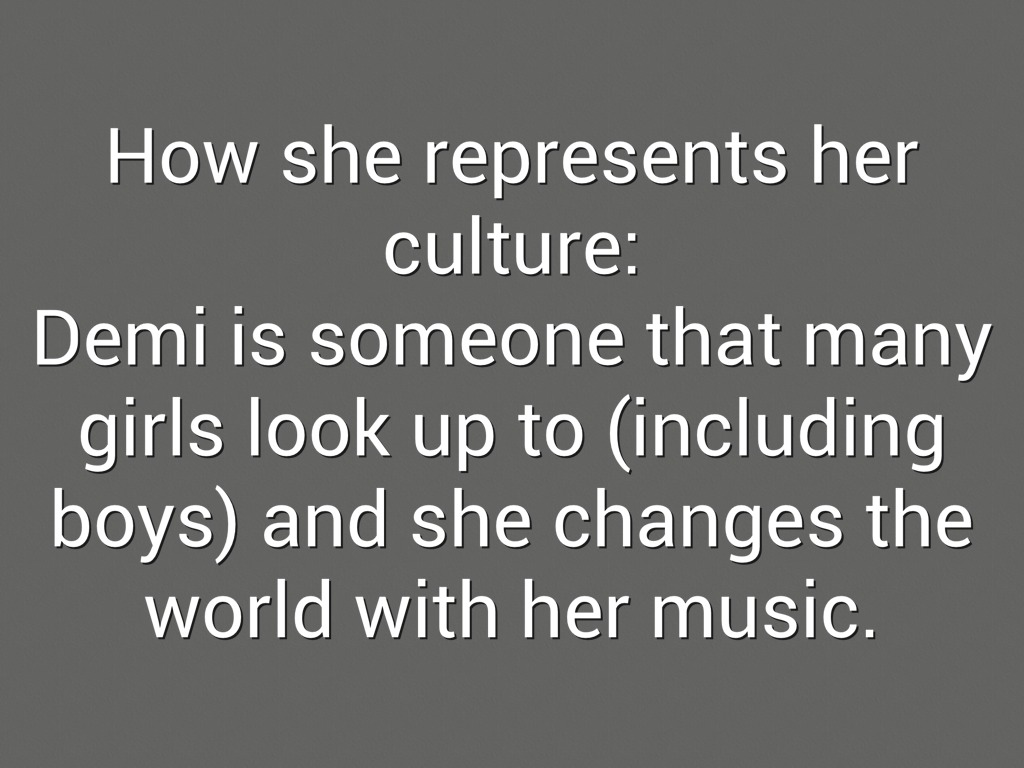 Demi is someone that many girls look up to (including boys) and she changes the world with her music.