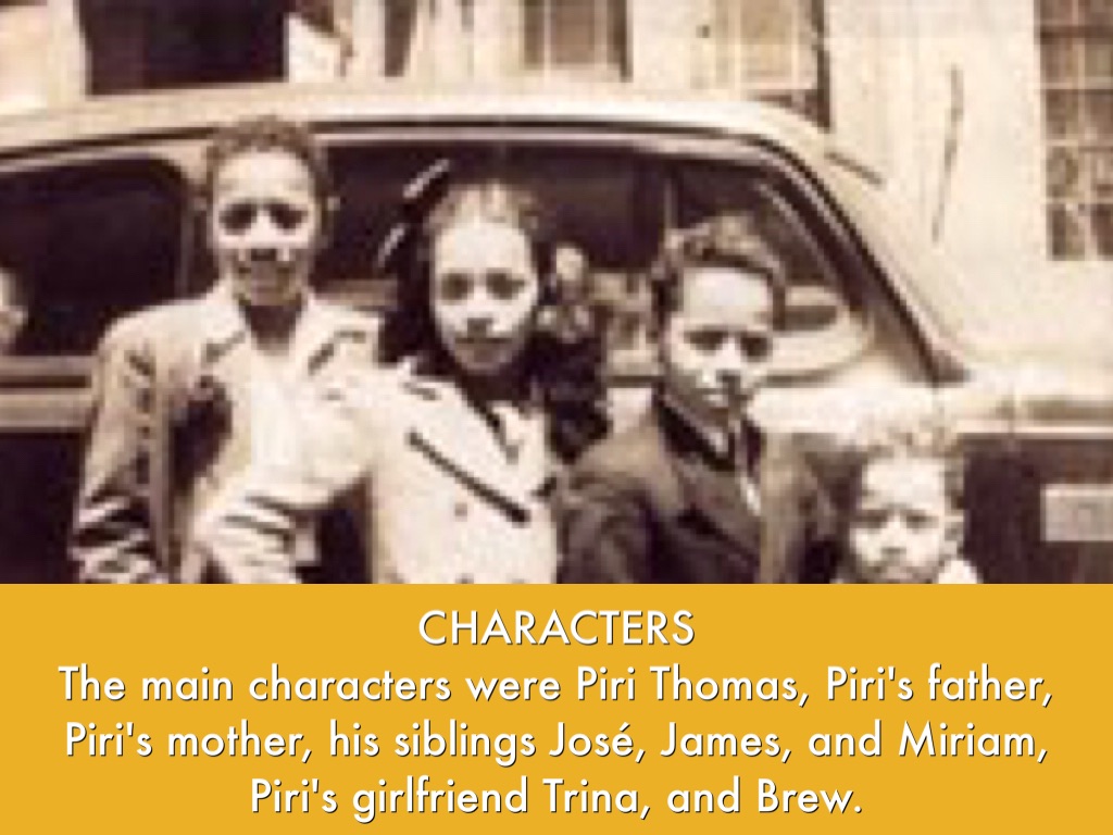 The main characters were Piri Thomas, Piri's father, Piri's mother, his siblings José, James, and Miriam, Piri's girlfriend Trina, and Brew.