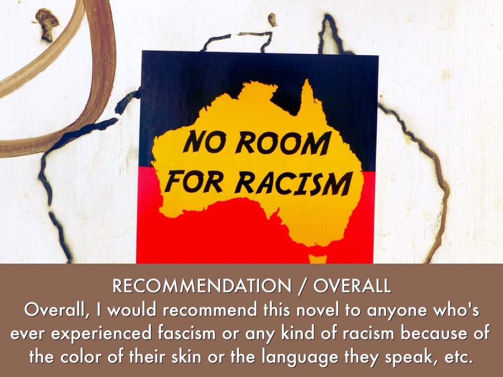 Overall, I would recommend this novel to anyone who's ever experienced fascism or any kind of racism because of the color of their skin or the language they speak, etc.