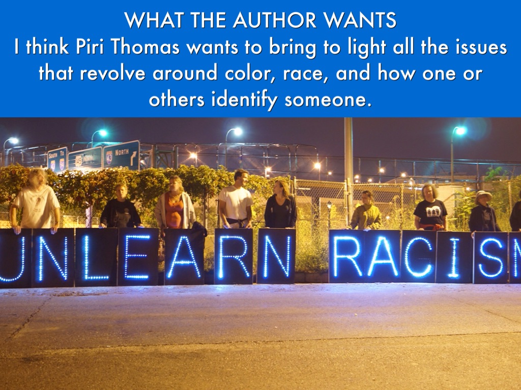 I think Piri Thomas wants to bring to light all the issues that revolve around color, race, and how one or others identify someone.