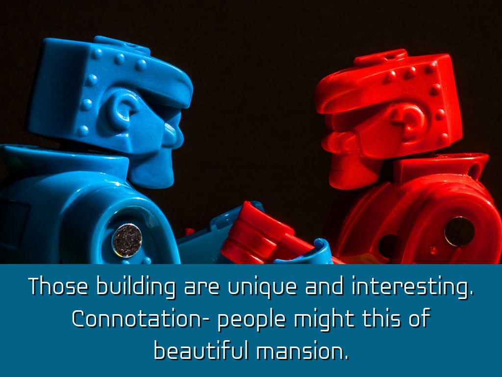 Those building are unique and interesting. Connotation- people might this of beautiful mansion.