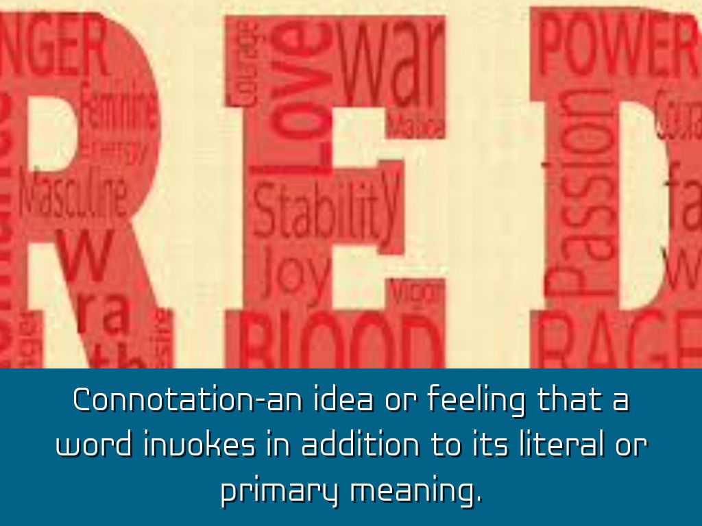 Connotation-an idea or feeling that a word invokes in addition to its literal or primary meaning.