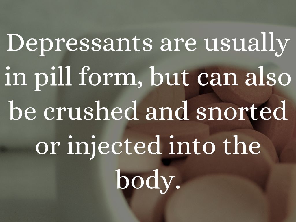 Depressants are usually in pill form, but can also be crushed and snorted or injected into the body.