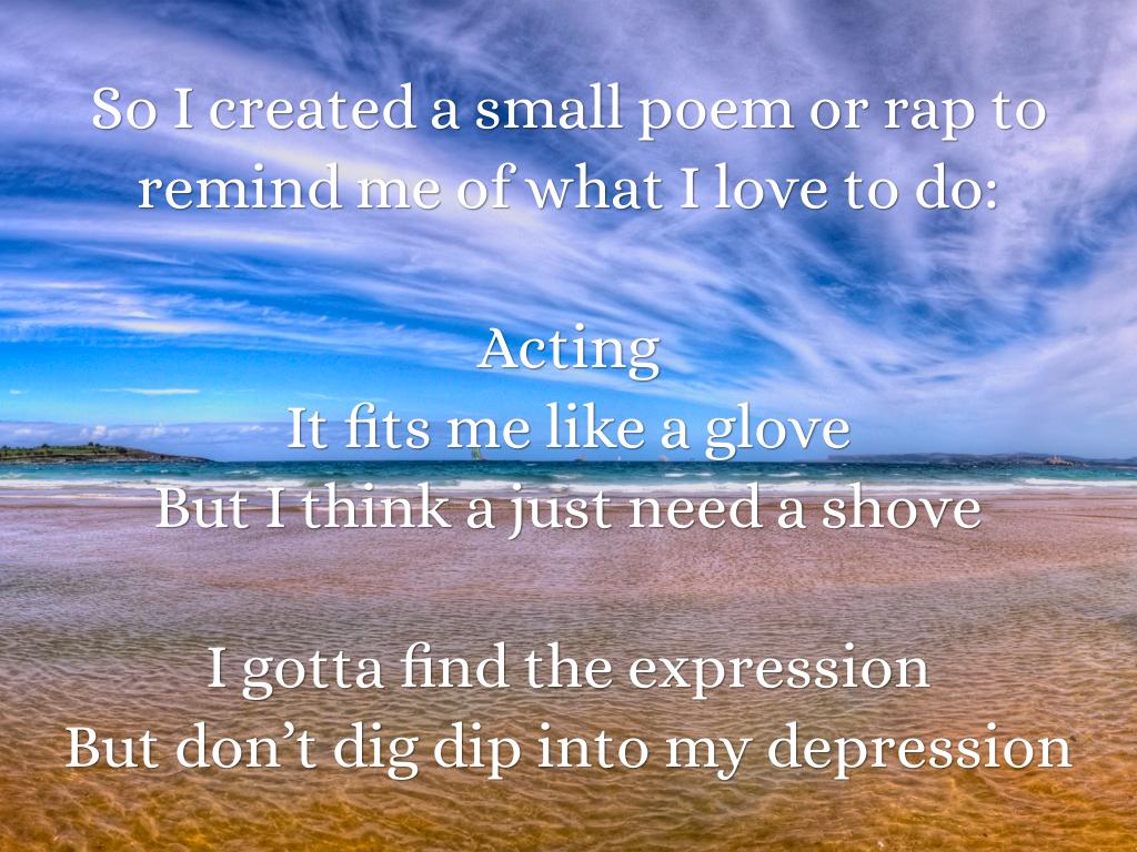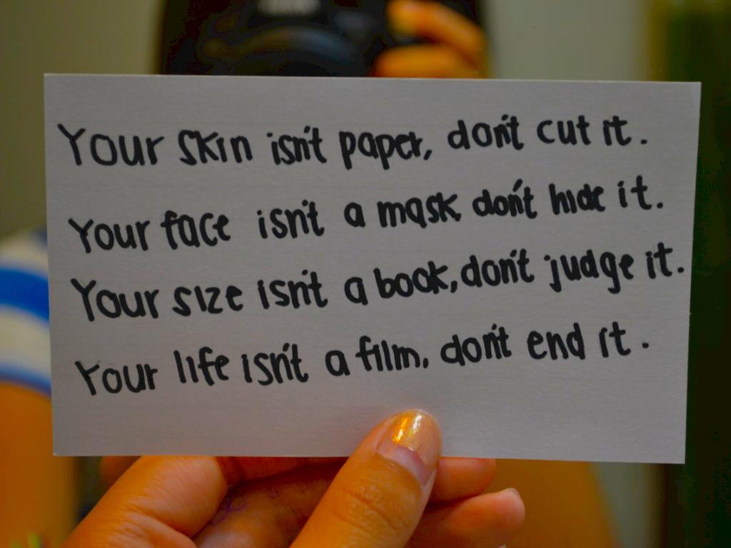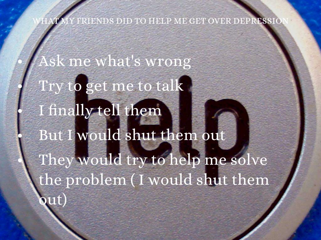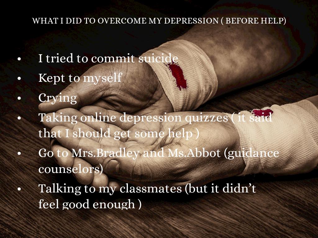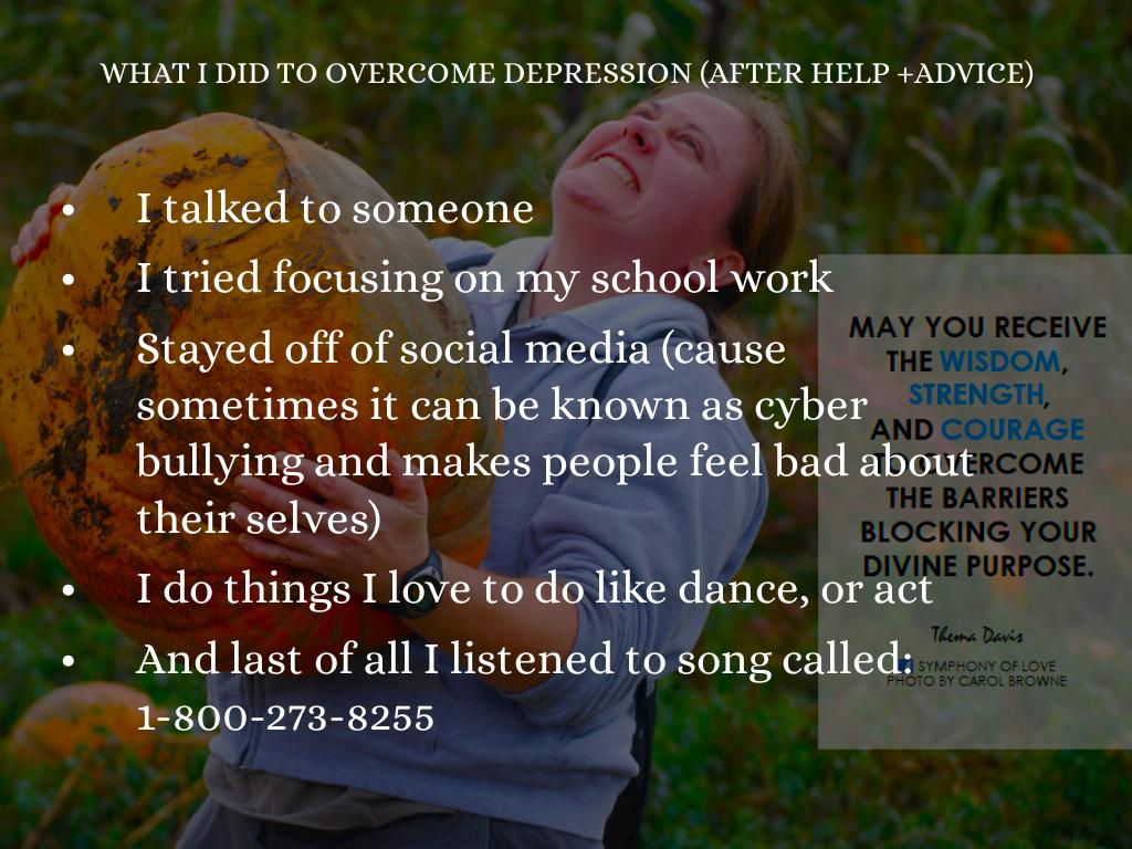 But I had true friends Who helped me get through Depression. And helped me realize that I’m worth it. And that I I’m probably just going through a phase And they help me get over it. I talked to my parents, teachers, an adult. Tried to make a list of things that were probably bothering me like if I’m stressed or if I feel like I can’t do anything right I’ll just take deep breaths and talk to someone.