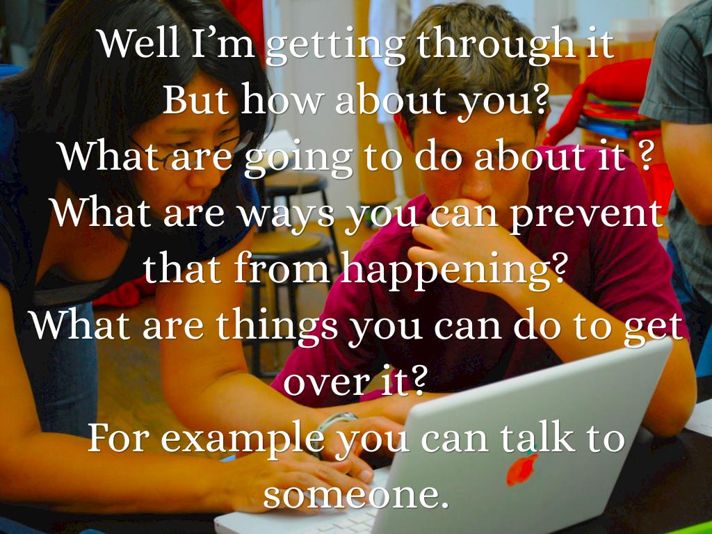 Well I’m getting through it But how about you? What are going to do about it ? What are ways you can prevent that from happening? What are things you can do to get over it? For example you can talk to someone.