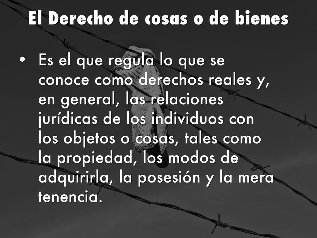 • Es el que regula lo que se conoce como derechos reales y, en general, las relaciones jurídicas de los individuos con los objetos o cosas, tales como la propiedad, los modos de adquirirla, la posesión y la mera tenencia.