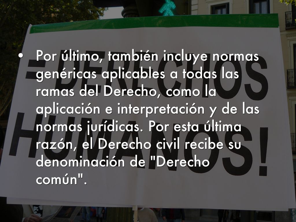 • Por último, también incluye normas genéricas aplicables a todas las ramas del Derecho, como la aplicación e interpretación y de las normas jurídicas. Por esta última razón, el Derecho civil recibe su denominación de "Derecho común".