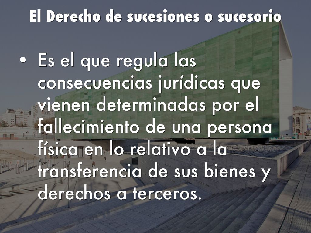 • Es el que regula las consecuencias jurídicas que vienen determinadas por el fallecimiento de una persona física en lo relativo a la transferencia de sus bienes y derechos a terceros.