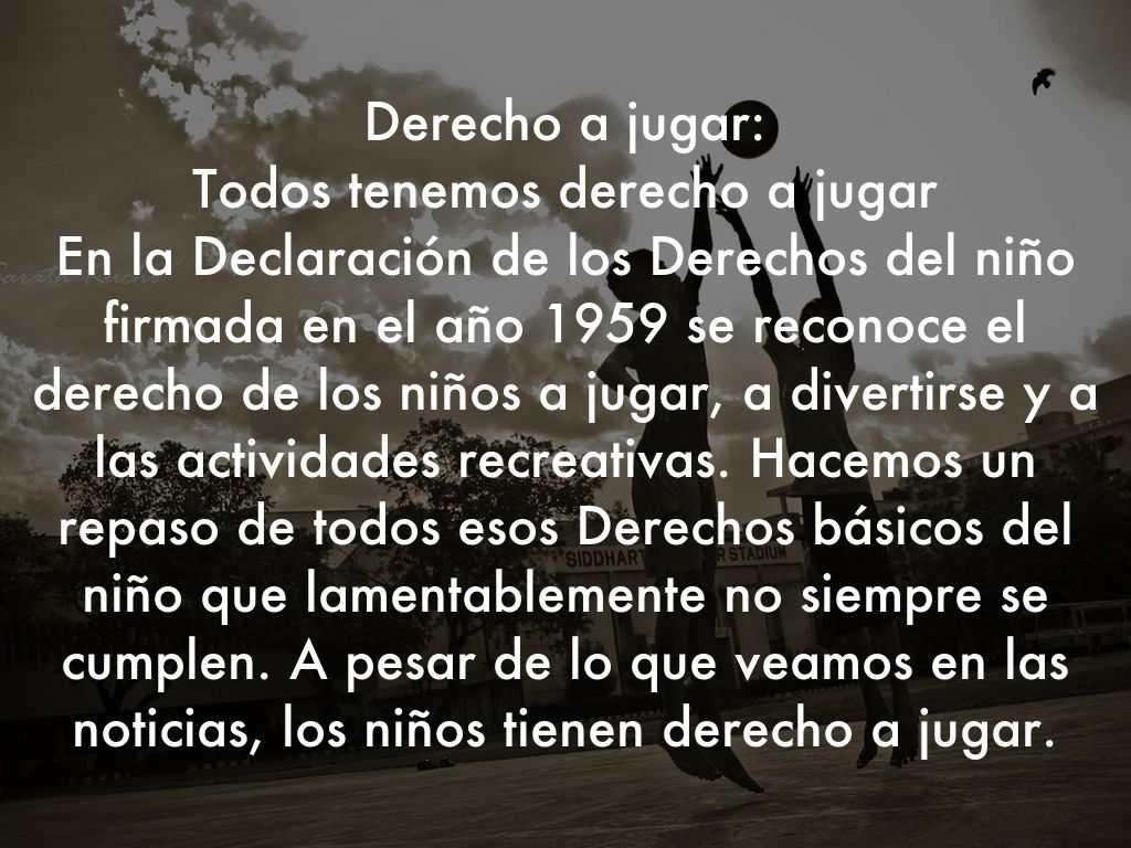 Derecho a jugar: Todos tenemos derecho a jugar En la Declaración de los Derechos del niño firmada en el año 1959 se reconoce el derecho de los niños a jugar, a divertirse y a las actividades recreativas. Hacemos un repaso de todos esos Derechos básicos del niño que lamentablemente no siempre se cumplen. A pesar de lo que veamos en las noticias, los niños tienen derecho a jugar.