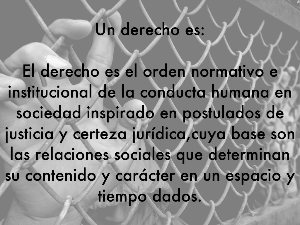 El derecho es el orden normativo e institucional de la conducta humana en sociedad inspirado en postulados de justicia y certeza jurídica,cuya base son las relaciones sociales que determinan su contenido y carácter en un espacio y tiempo dados.