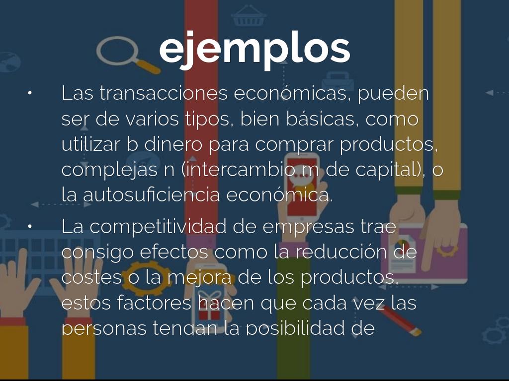 Las transacciones económicas, pueden ser de varios tipos, bien básicas, como utilizar b dinero para comprar productos, complejas n (intercambio m de capital), o la autosuficiencia económica.