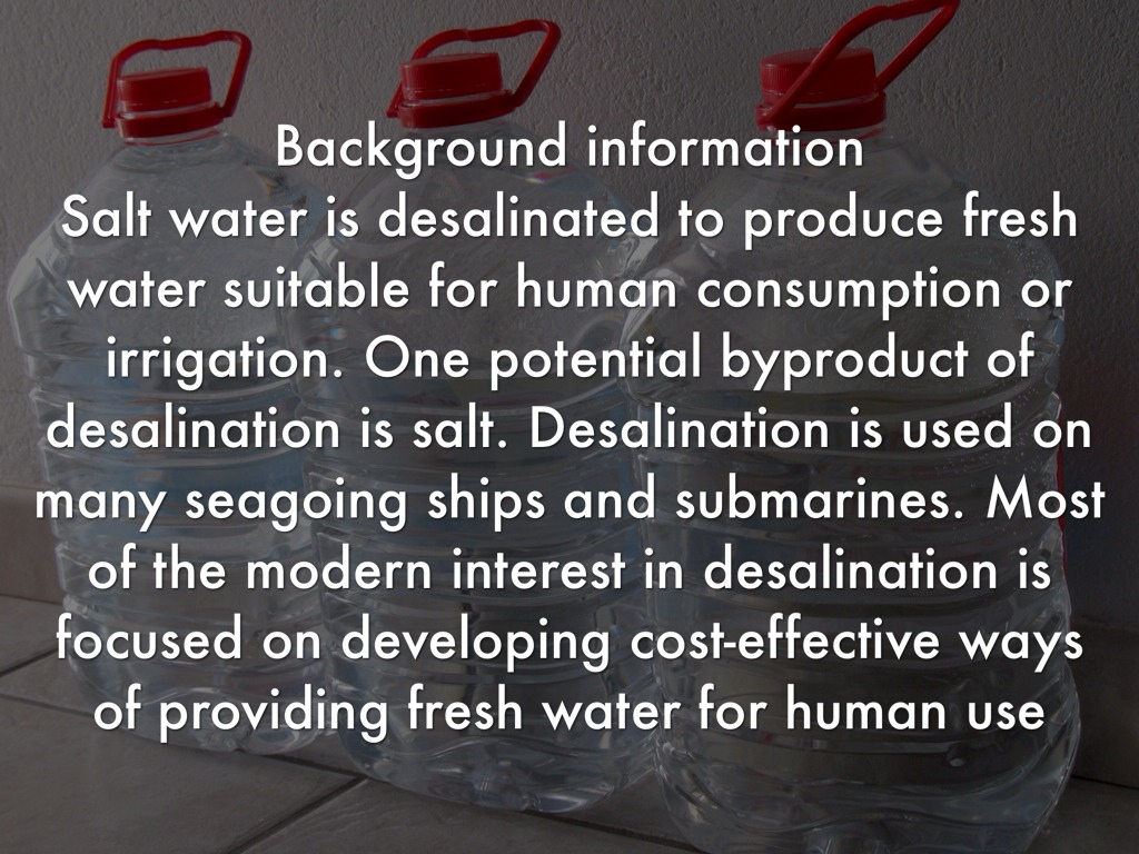 Background information Salt water is desalinated to produce fresh water suitable for human consumption or irrigation. One potential byproduct of desalination is salt. Desalination is used on many seagoing ships and submarines. Most of the modern interest in desalination is focused on developing cost-effective ways of providing fresh water for human use
