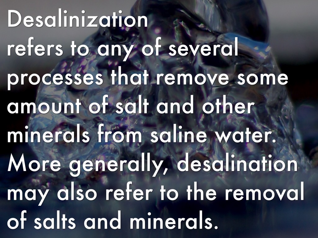 Desalinization refers to any of several processes that remove some amount of salt and other minerals from saline water. More generally, desalination may also refer to the removal of salts and minerals.