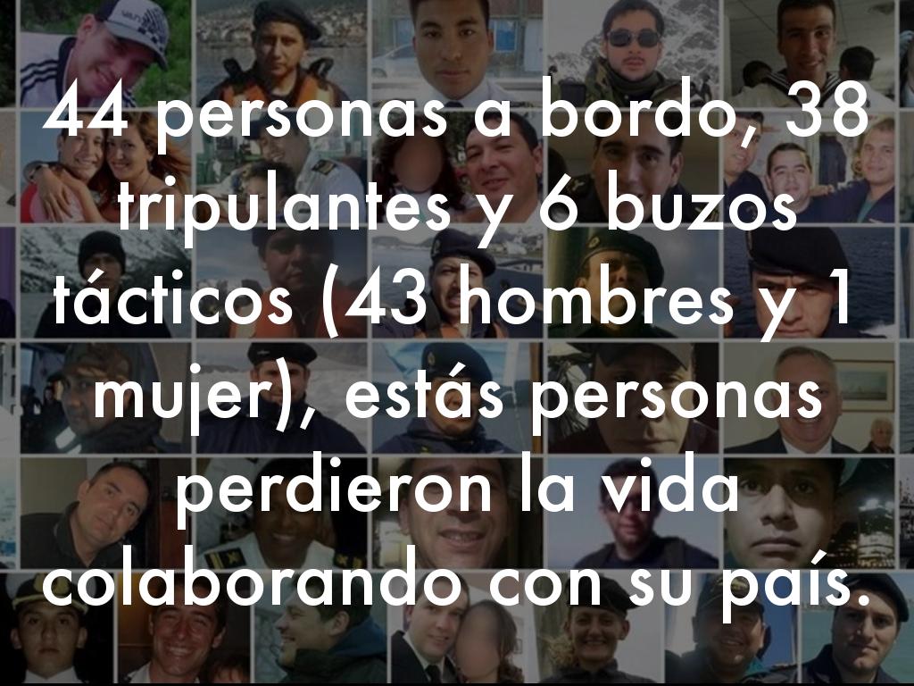 44 personas a bordo, 38 tripulantes y 6 buzos tácticos (43 hombres y 1 mujer), estás personas perdieron la vida colaborando con su país.