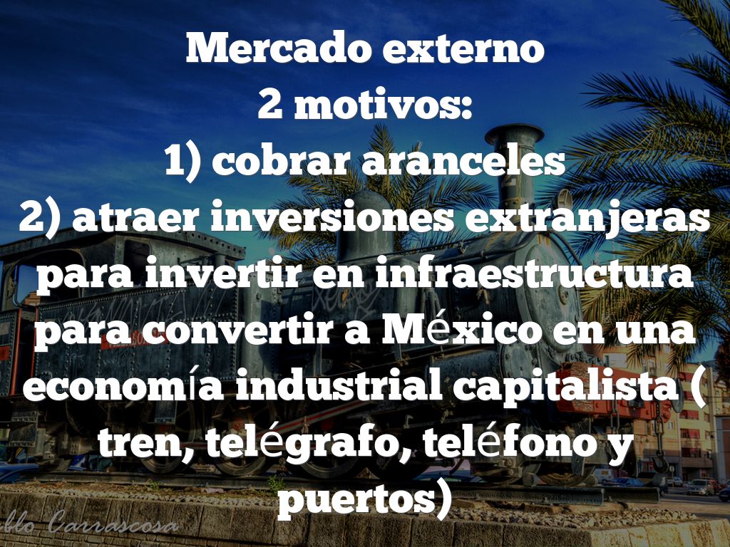 Mercado externo 2 motivos: 1) cobrar aranceles 2) atraer inversiones extranjeras para invertir en infraestructura para convertir a México en una economía industrial capitalista ( tren, telégrafo, teléfono y puertos)