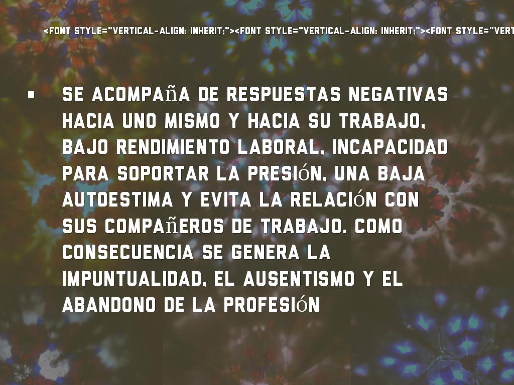 Se acompaña de respuestas negativas hacia uno mismo y hacia su trabajo, bajo rendimiento laboral, incapacidad para soportar la presión, una baja autoestima y evita la relación con sus compañeros de trabajo. Como consecuencia se genera la impuntualidad, el ausentismo y el abandono de la profesión