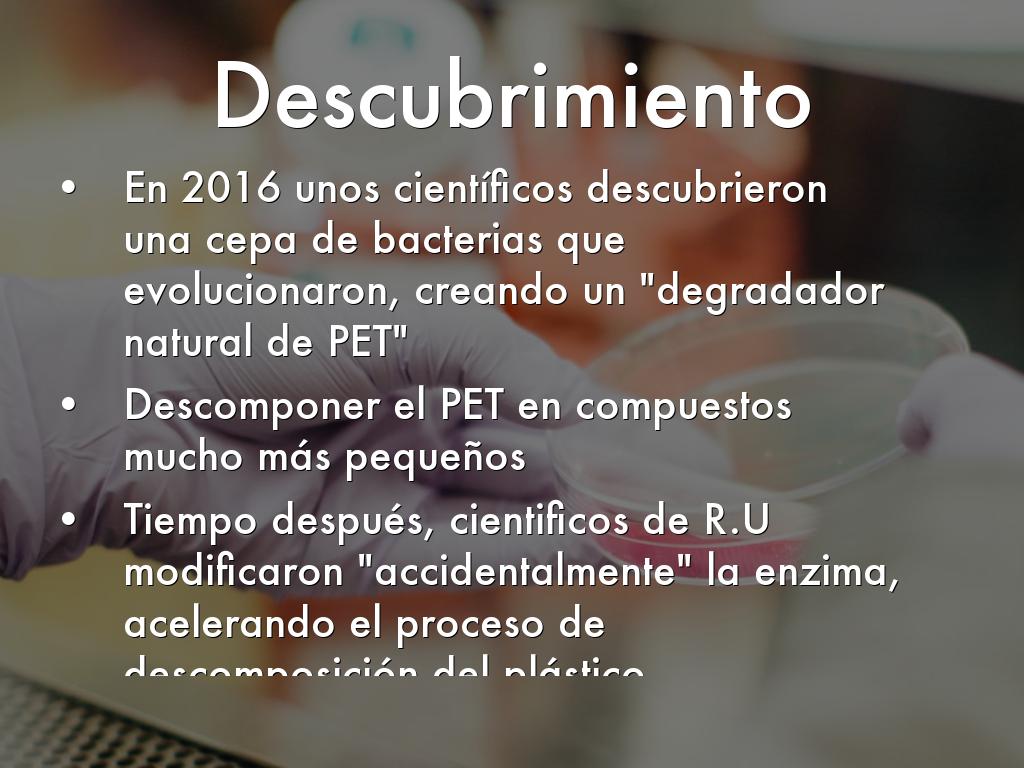 Tiempo después, cientificos de R.U modificaron "accidentalmente" la enzima, acelerando el proceso de descomposición del plástico.