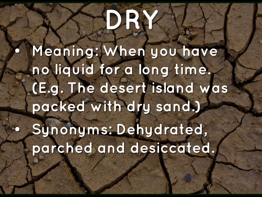 • Meaning: When you have no liquid for a long time. (E.g. The desert island was packed with dry sand.)