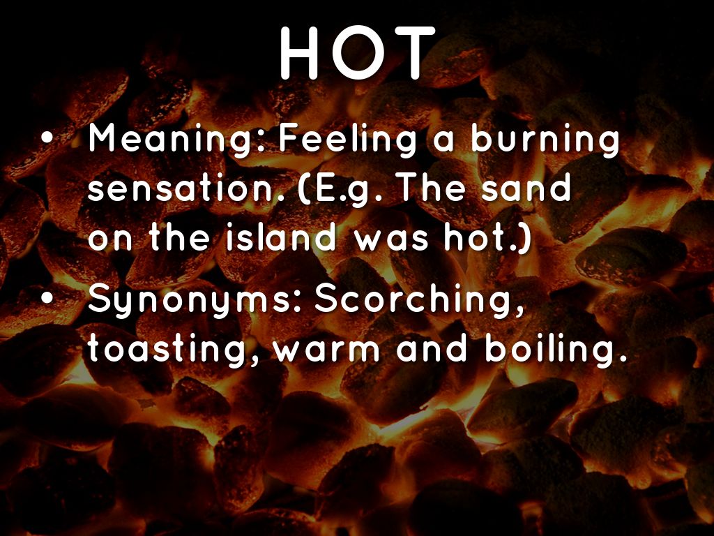 • Meaning: Feeling a burning sensation. (E.g. The sand on the island was hot.)
