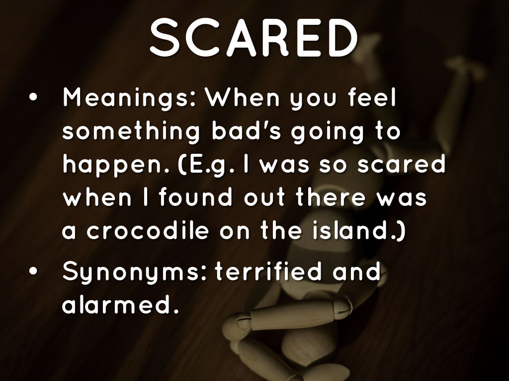 • Meanings: When you feel something bad's going to happen. (E.g. I was so scared when I found out there was a crocodile on the island.)