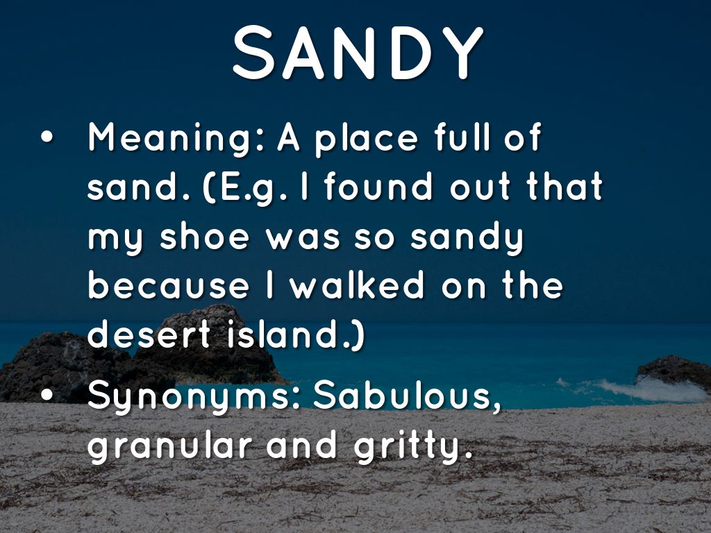 • Meaning: A place full of sand. (E.g. I found out that my shoe was so sandy because I walked on the desert island.)
