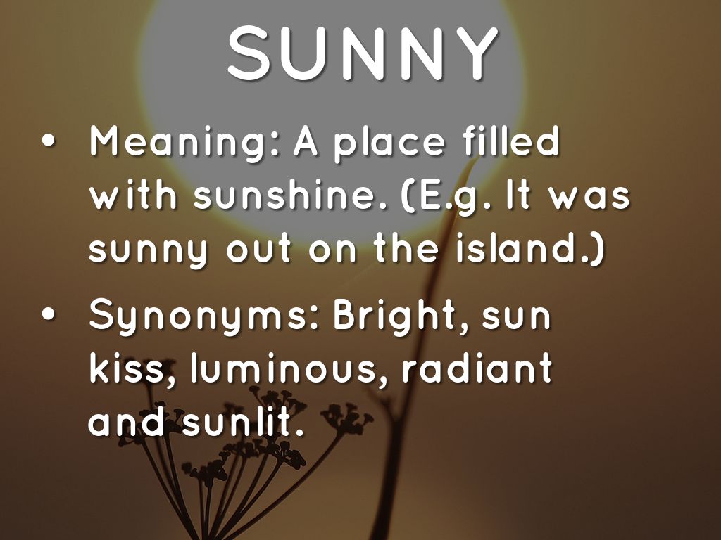 • Meaning: A place filled with sunshine. (E.g. It was sunny out on the island.)