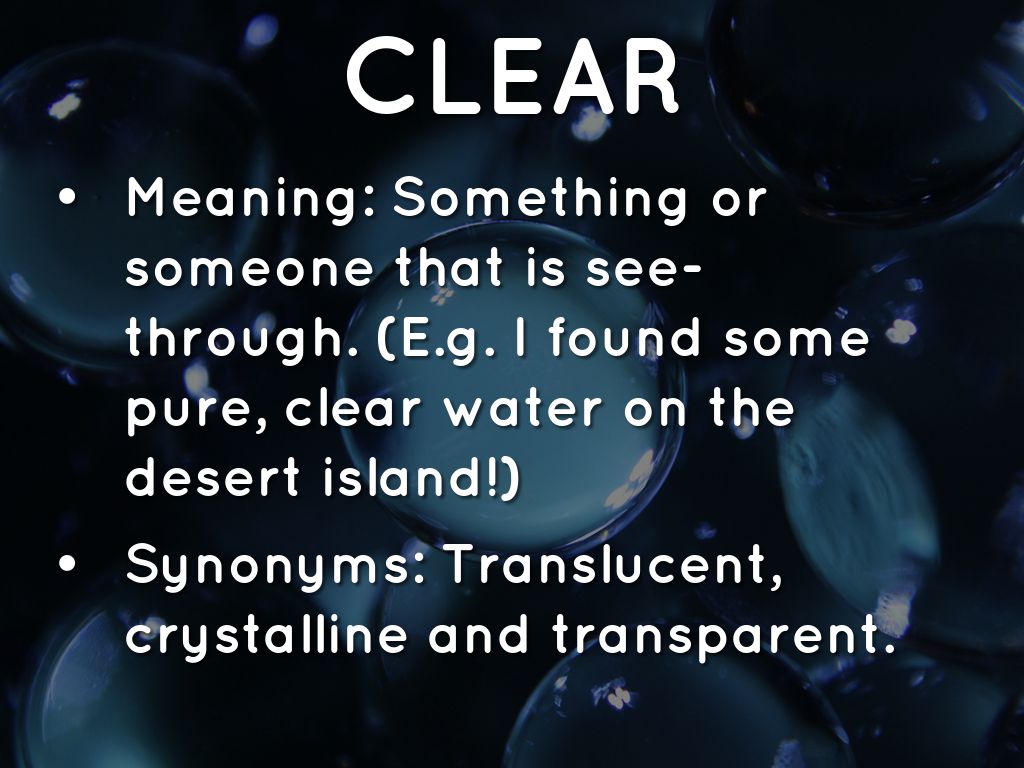 • Meaning: Something or someone that is see-through. (E.g. I found some pure, clear water on the desert island!)