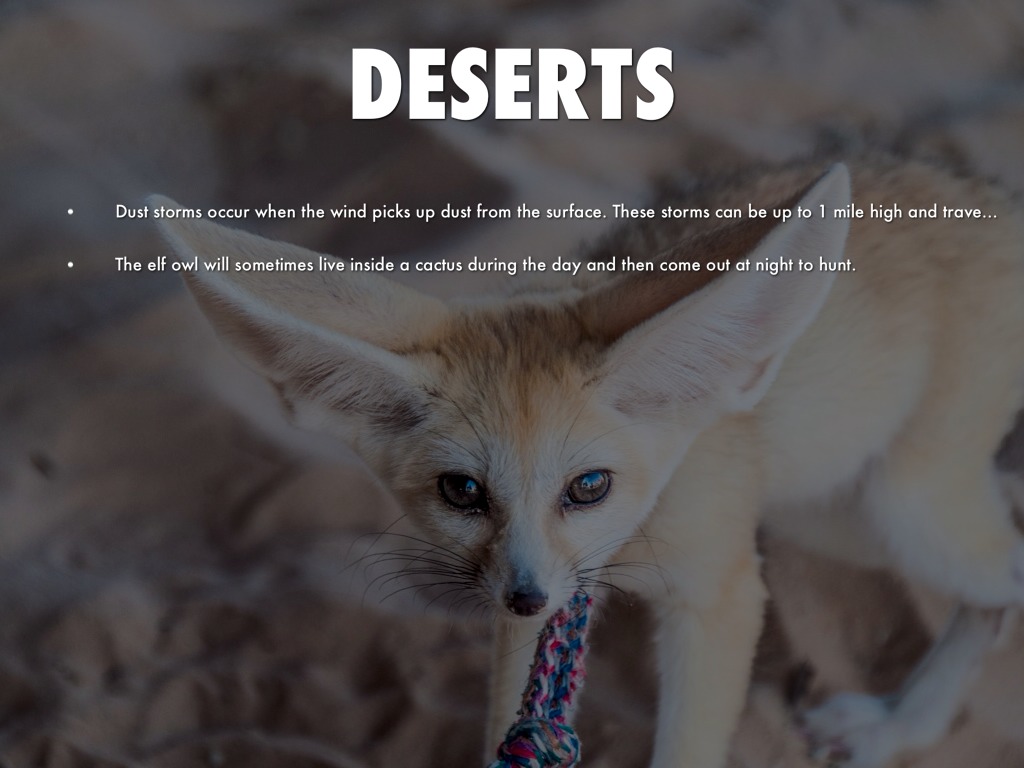 • There are relatively few large mammals in deserts because most are not capable of storing sufficient water and withstanding the heat.