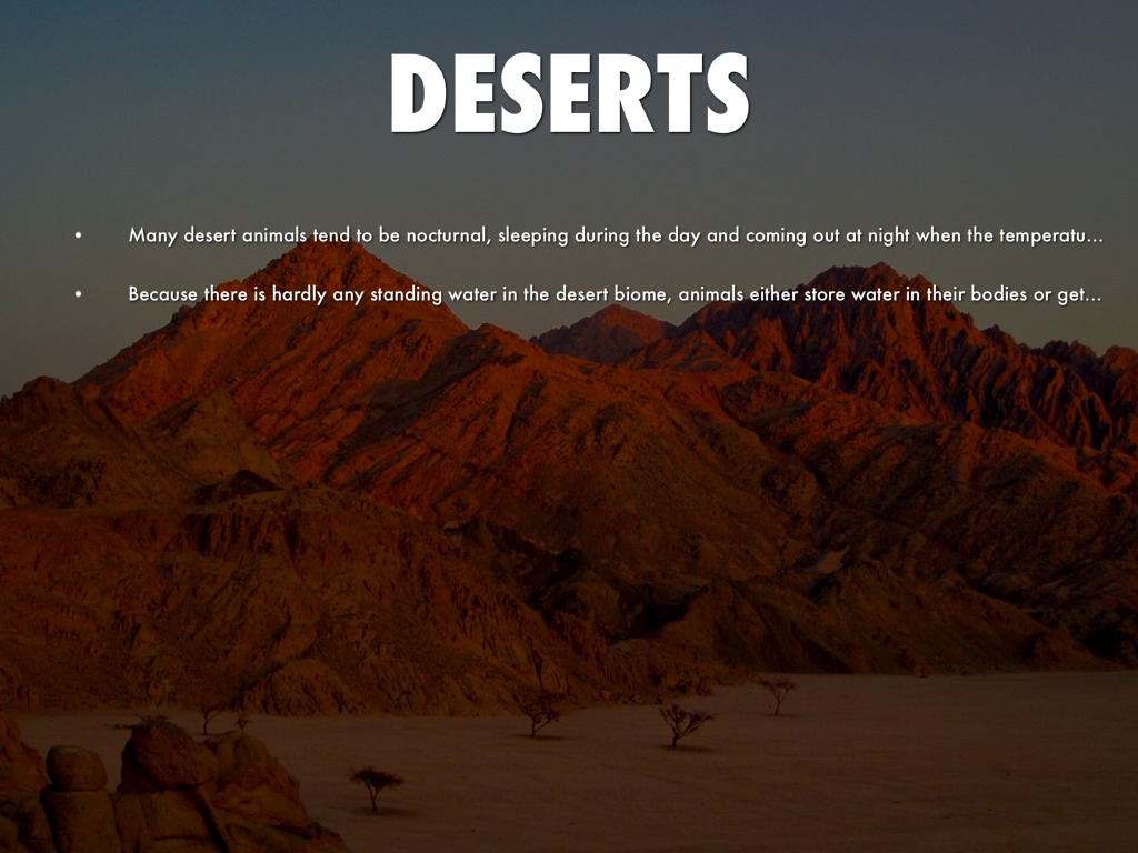 • Because there is hardly any standing water in the desert biome, animals either store water in their bodies or get their water needs met by the foods they eat.