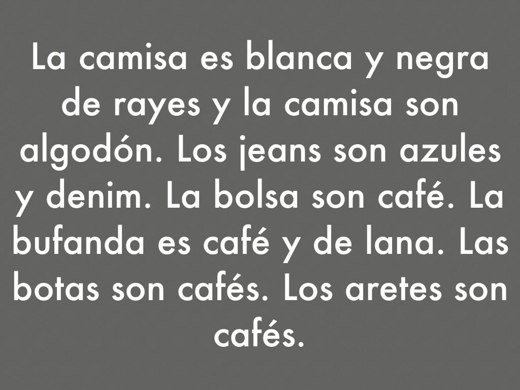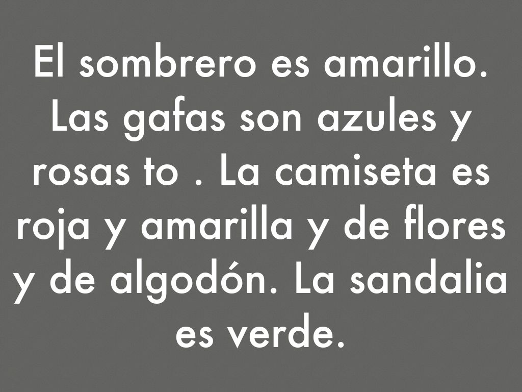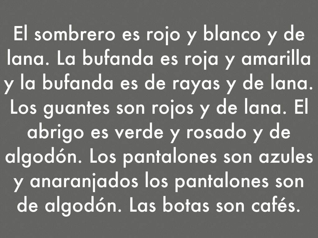 El sombrero es rojo y blanco y de lana. La bufanda es roja y amarilla y la bufanda es de rayas y de lana. Los guantes son rojos y de lana. El abrigo es verde y rosado y de algodón. Los pantalones son azules y anaranjados los pantalones son de algodón. Las botas son cafés.