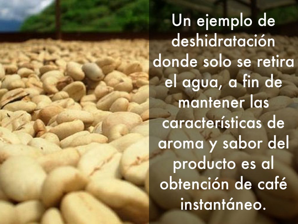 Un ejemplo de deshidratación donde solo se retira el agua, a fin de mantener las características de aroma y sabor del producto es al obtención de café instantáneo.