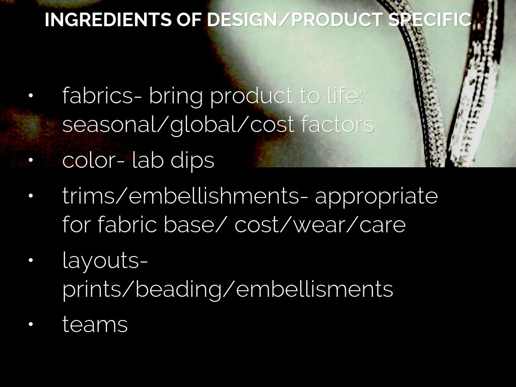 INGREDIENTS OF DESIGN/PRODUCT SPECIFIC