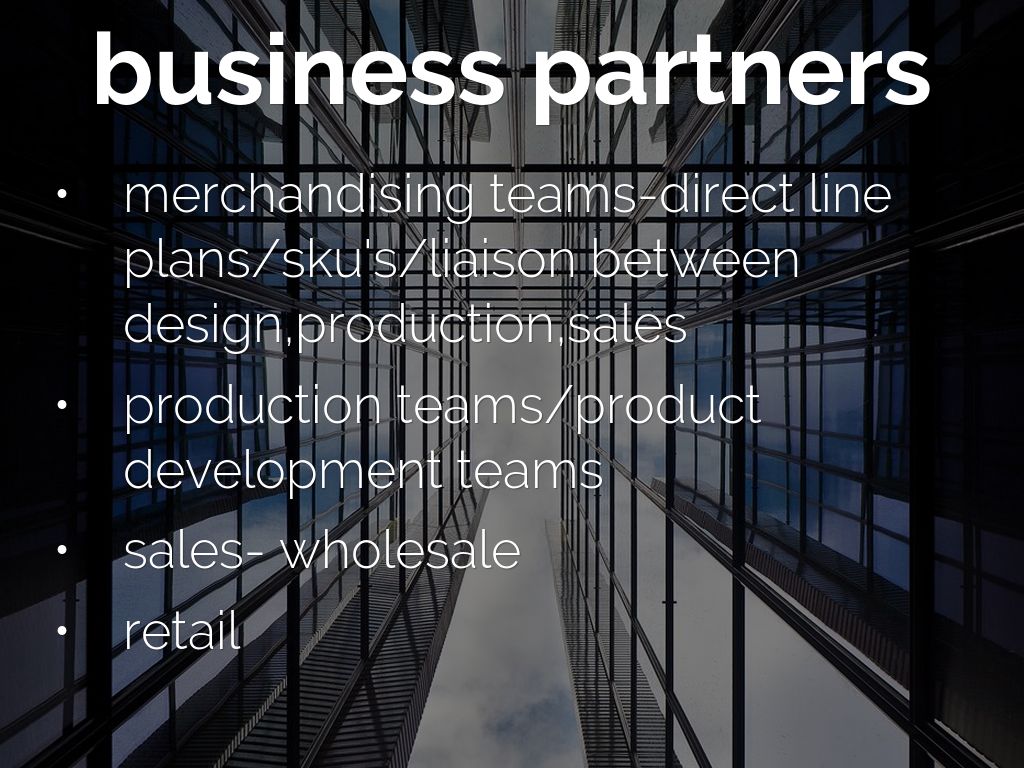 merchandising teams-direct line plans/sku's/liaison between design,production,sales