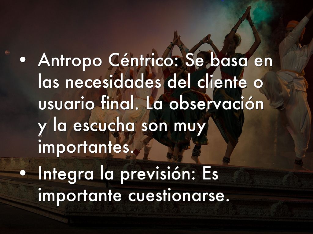 Antropo Céntrico: Se basa en las necesidades del cliente o usuario final. La observación y la escucha son muy importantes.