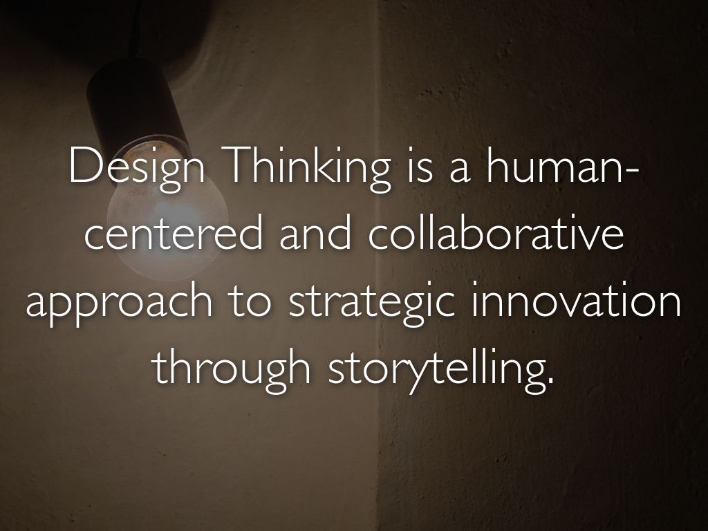 Design Thinking is a human-centered and collaborative approach to strategic innovation through storytelling.