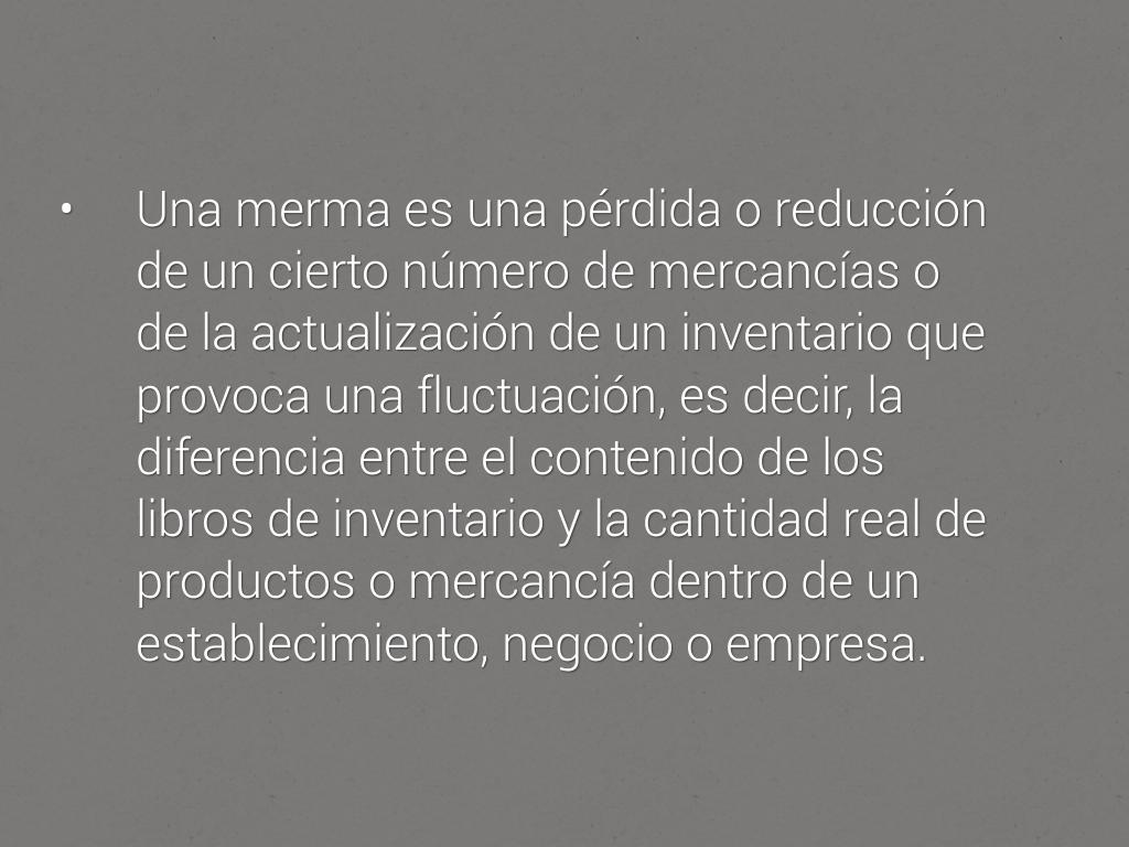 • Una merma es una pérdida o reducción de un cierto número de mercancías o de la actualización de un inventario que provoca una fluctuación, es decir, la diferencia entre el contenido de los libros de inventario y la cantidad real de productos o mercancía dentro de un establecimiento, negocio o empresa.