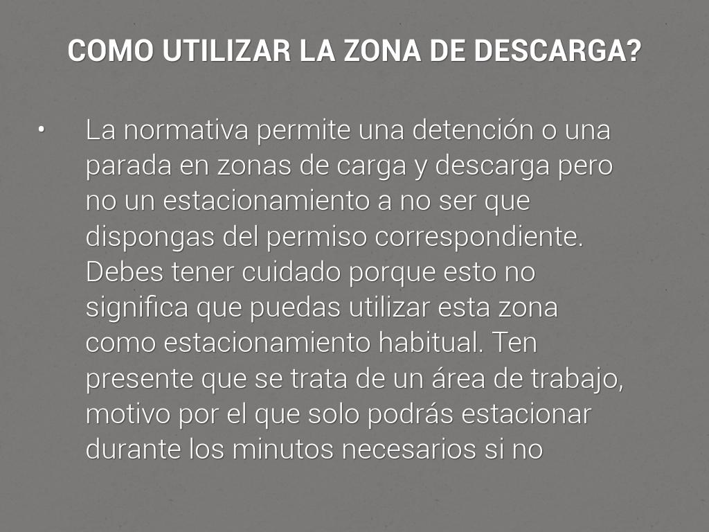 • La normativa permite una detención o una parada en zonas de carga y descarga pero no un estacionamiento a no ser que dispongas del permiso correspondiente. Debes tener cuidado porque esto no significa que puedas utilizar esta zona como estacionamiento habitual. Ten presente que se trata de un área de trabajo, motivo por el que solo podrás estacionar durante los minutos necesarios si no quieres ser sancionado.