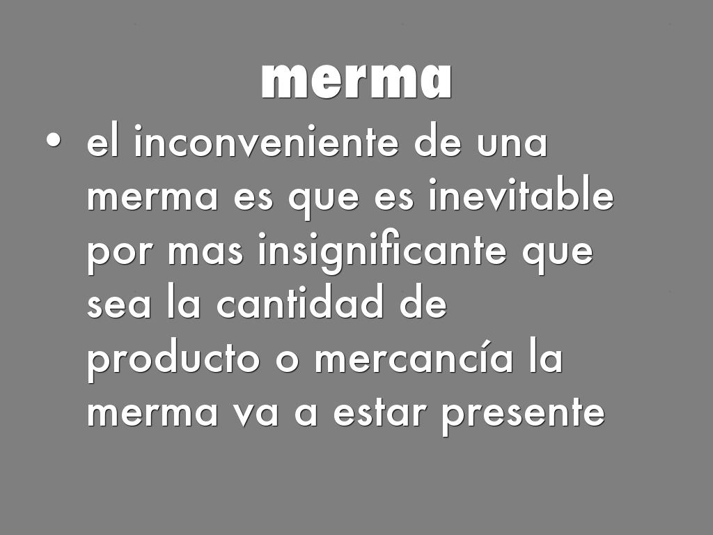 la merma es una perdida o reduccion de un cierto numero de mercancías o de la actualizacion de un inventario que provoca una FLUCTUACIÓN es decir la diferencia entre los libros de inventario y la cantidad real de mercancía o producto dentro de la empresa