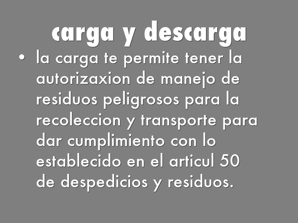 la carga te permite tener la autorizaxion de manejo de residuos peligrosos para la recoleccion y transporte para dar cumplimiento con lo establecido en el articul 50 de despedicios y residuos.