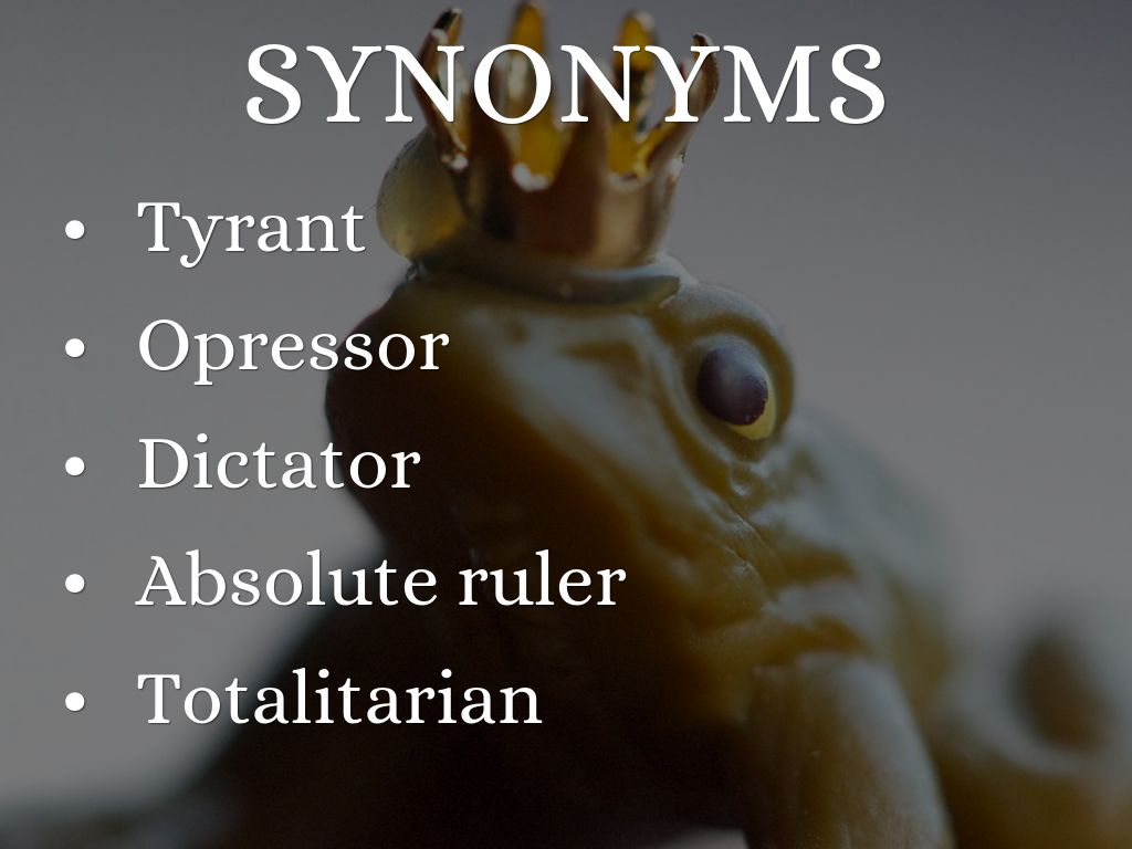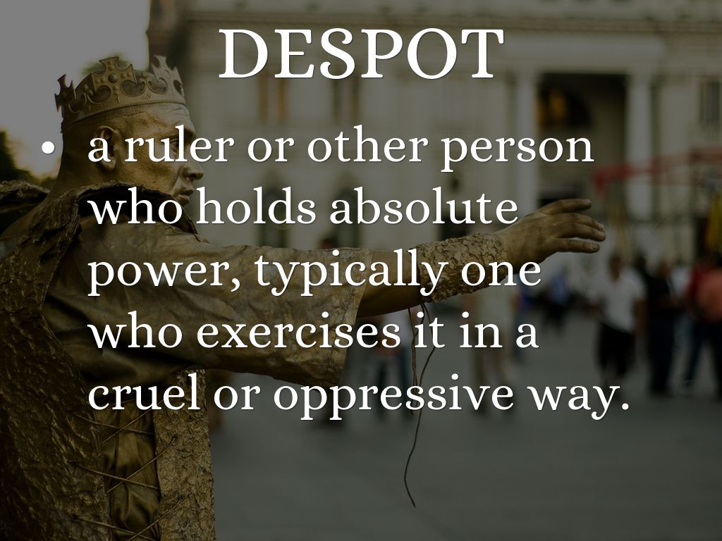 a ruler or other person who holds absolute power, typically one who exercises it in a cruel or oppressive way.