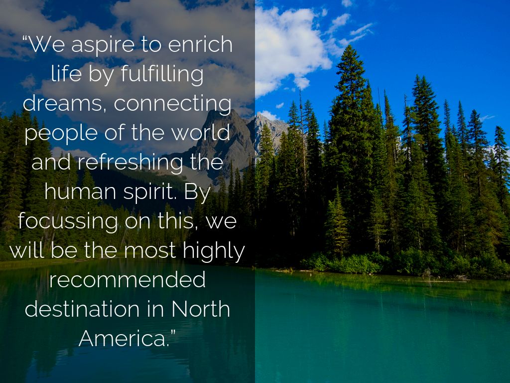 “We aspire to enrich life by fulfilling dreams, connecting people of the world and refreshing the human spirit. By focussing on this, we will be the most highly recommended destination in North America.”