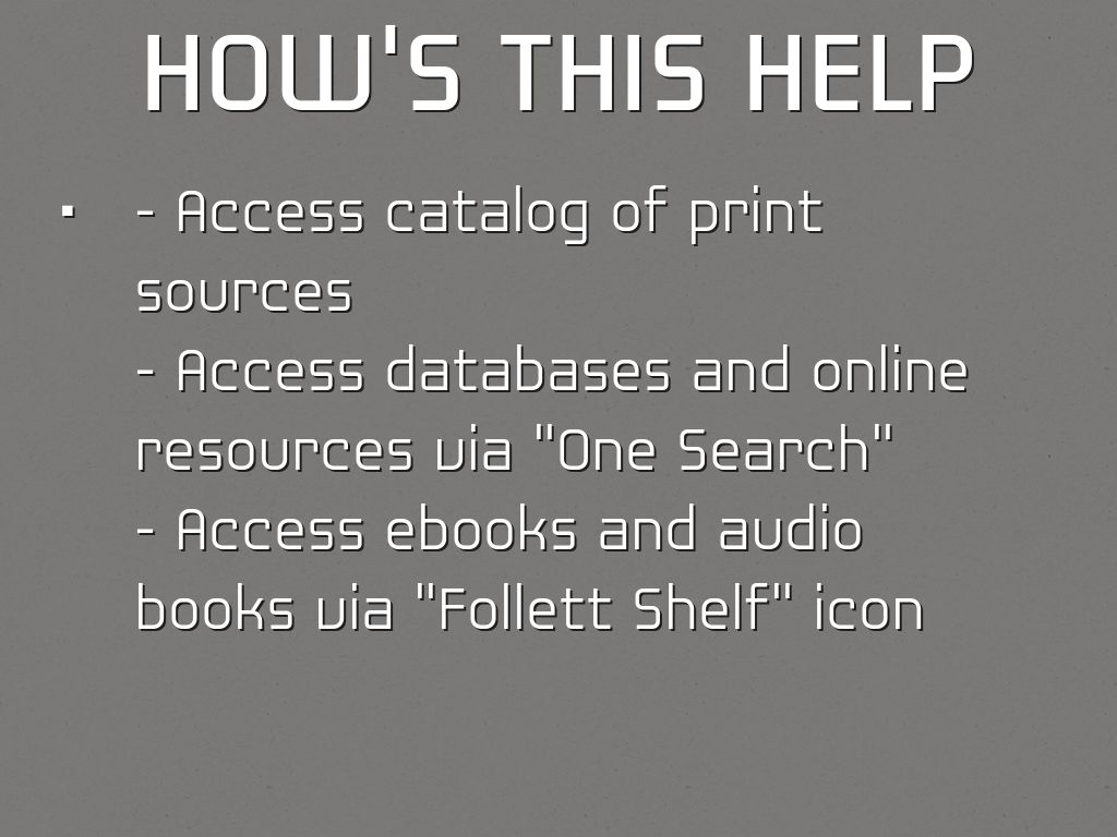 - Access catalog of print sources - Access databases and online resources via "One Search" - Access ebooks and audio books via "Follett Shelf" icon