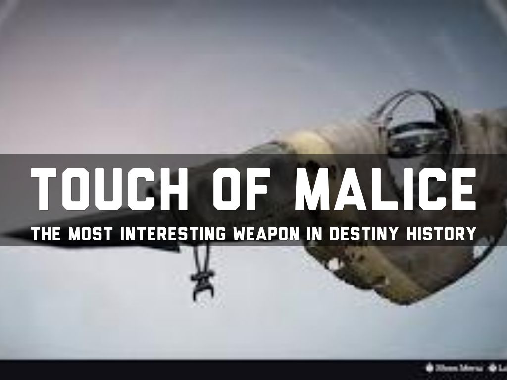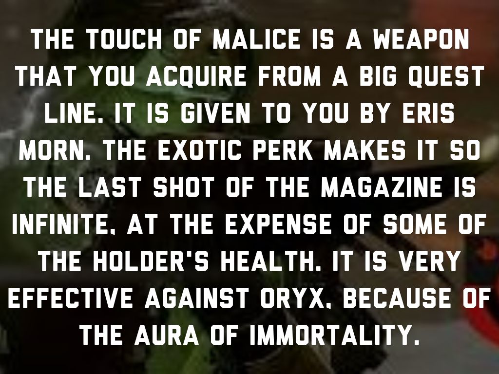 The touch of malice is a weapon that you acquire from a big quest line. It is given to you by eris morn. the exotic perk makes it so the last shot of the magazine is infinite, at the expense of some of the holder's health. it is very effective against oryx, because of the aura of immortality.