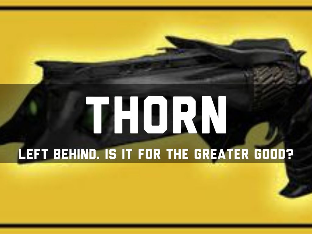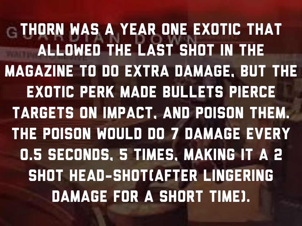 Thorn was a year one exotic that allowed the last shot in the magazine to do extra damage, but the exotic perk made bullets pierce targets on impact, and poison them. The poison would do 7 damage every 0.5 seconds, 5 times, making it a 2 shot head-shot(after lingering damage for a short time).